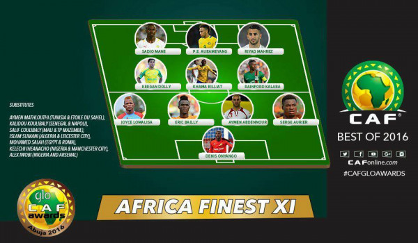 وأعلن الإتحاد الإفريقي لكرة القدم خلال هذا الحفل عن التشكيلة المثالية لسنة 2016 والتي شهدت تواجد النجم رياض محرز ممثل الجزائر الوحيد في التشكيلة الأساسية،فيما تواجد إسلام سليماني زميله في ليستر سيتي وهداف المنتخب الوطني في الاحتياط، وضمت تشكيلة "الكاف" مزيجا من لاعبين محترفين في أفضل الدوريات الأوروبية وآخرين في البطولا ت المحلية ممن تألقوا في البطولات القارية مع فرقهم، كما أضاف قائمة إحتياطية مكونة من 6 لاعبين بالإضافة إلى إسلام سليماني وهم، محمد صلاح نجم المنتخب المصري، خاليدو كوليبالي مدافع السنغال، ساليف كوليبالي المتوج مع مازيمبي بلقب كأس الكونفدرالية الإريقية، بالإضافة إلى النيجيريان كيليشي إيهيناشتو وأليكس اووبي، وفيما يلي التشكيلة الأساسية كاملة: