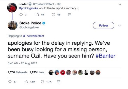 وكان ستيفان جيرارد نحم ليفربول السابق ومحلل شبكة قنوات "BT SPORTS" أول من انتفد النجم الألماني وعدم مساندة زملاءه، لتتواصل السخرية من لاعب ريال مدريد السابق على مواقع التواصل الإجتماعي، حيث غرد أحد مشجعي أرسنال قائلا: "أود التبليغ عن سرقة" في إشارة منه إلى قرارات الحكم الخاطئة ضد "الغينيرز" ليأتي الرد بشكل مفاجئ وساخر من الحساب الرسمي لشرطة ستوك التي ردت: "نعتذر عن التأخير في الرد، كنا بصدد البحث عن شخص مفقود اسمه العائلي أوزيل، هل رأيته؟"