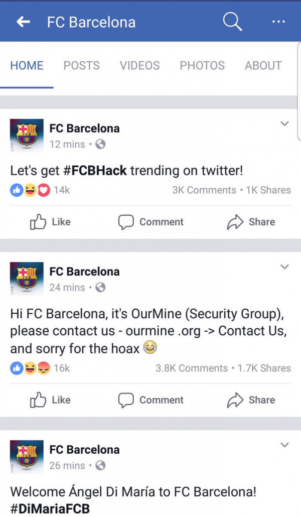 وتم الإعلان عن اختراق الحساب الرسمي للنادي فجر الأربعاء وعرضت المجموعة خدماتها الأمنية الإلكترونية، فيما نشرت تغريدة أخرى ترحب فيها بالتعاقد مع أنخيل دي ماريا نجم باريس سان جيرمان، وقامت بنفس الشيء من خلال الحساب الرسمي لـ"البارصا" على الفايسبوك" وأعلن النادي الكتالوني صبيحة اليوم استعادة الحساب الرسمي.