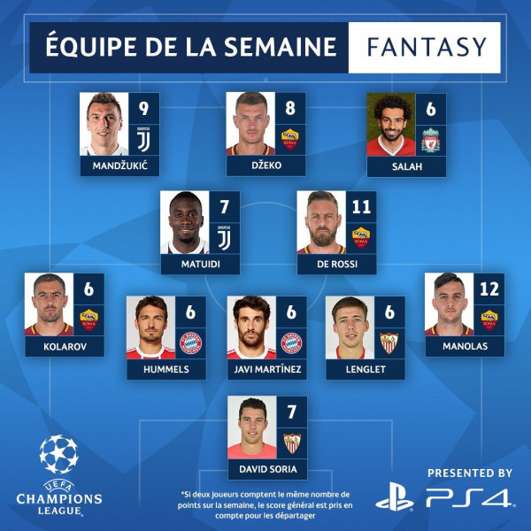 وأعلن الإتحاد الأوروبي عن التشكيلة المثالية لإياب ربع نهائي دوري أبطال أوروبا بعد إجراء المباريات الأربعة والتي شهدت سيطرة لاعبي روما، بعد الريمونتادا التاريخية ضد برشلونة والفوز الكبير بثلاثية نظيفة، فيما غاب نجوم الريال عن التشكيلة بعد الهزيمة أمام جوفنتوس والتي لم تمنعهم من التأهل إلى نصف النهائي.