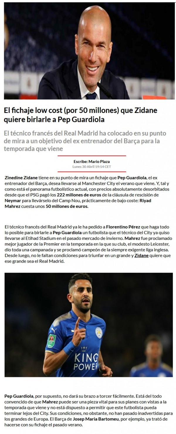 وأكد موقع "دون بالون" بأن زين الدين زيدان مدرب ريال مدريد، طلب بالفعل من رئيسه فلورينتينو بيريز الإسراع في التعاقد مع نجم ليستر سيتي، ليكشف التقرير عن إعجاب التقني الفرانكو جزائري بالإمكانيات التي يتمتع بها محرز، كما أن سعره يُحفز النادي الملكي على التعاقد معه، رغم ذكر الموقع بأن قيمته في حدود 50 مليون أورو، دون الانتباه لأن ليستر سيتي سبق له رفض قيمة أكبر من 60 مليونا للتفريط في خدمات نجمه في الميركاتو الشتوي المنقضي إلى مانشستر سيتي، ويبقى موقع "دون بالون" كذلك غير موثوق بالنسبة للعديد من المتابعين، لذلك قد لا يُؤخذ الخبر محمل جد.