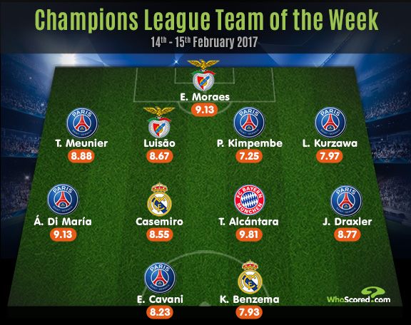 نشر موقع "هوسكورد" العالمي الخاص بإحصائيات مباريات كرة القدم، أفضل تشكيلة هذا الأسبوع في مباريات ذهاب الدور ثمن النهائي من دوري أبطال أوروبا، حيث عرفت إكتساح من لاعبي باريس سان جيرمان بتواجد 6 لاعبين أبرزهم كافاني ودي ماريا، التشكيلة جاءت على الشكل التالي: