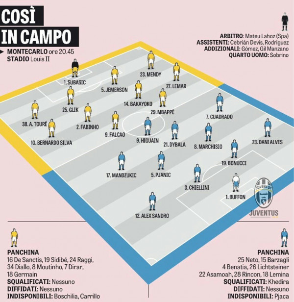 يستعد موناكو لإستضافة جوفنتوس في ذهاب نصف نهائي دوري أبطال أوروبا، حيث يسعى أبناء الإمارة إلى تسجيل نتيجة كبيرة تمكنهم من اللعب بكل راحة في لقاء العودة، فيما سيعمل أشبال المدرب ماسيميليانو أليغري على العودة بنتيجة إيجابية، وكانت العديد من الصحف الإيطالية قد نشرت صورة للتشكيلة المحتملة التي سيدخل بها كل فريق هذه المواجهة، والتي جاءت كما يلي:
