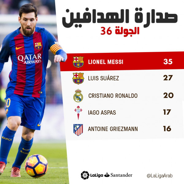 واصل ليونيل ميسي نجم برشلونة التحليق منفردا في صدارة قائمة أفضل الهدافين في الدوري الإسباني بعد ثنائيته في شباك فياريال، ورفع "البرغوث" رصيده إلى 35 هدفا خلال 32 مباراة لعبها مع "البارصا" في الليغا هذا الموسم، مبتعدا عن زميله وأقرب ملاحقيه لويس سواريز بفارق 8 أهداف.