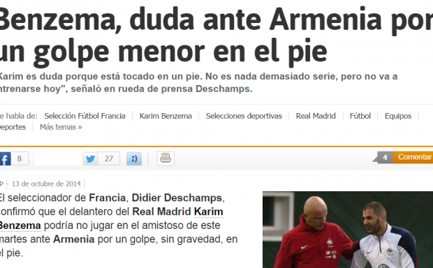 أكدت بعد وسائل الإعلام العالمية أن الدولي الفرنسي المهاجم كريم بن زيمة لاعب نادي ريال مدريد الإسباني قد يغيب عن منتخب بلاده في مباراة أرمينيا، كما أشار ديشان المدير الفني لمنتخب فرنسا إلى أن مهاجم الريال قد لا يلعب في مباراة الثلاثاء الودية أمام أرمينيا بسبب الإصابة، وصرح قائلا : "هناك شكوك تحوم حول مشاركة بن زيمة أمام أرمينيا، إنه يعاني من بعض المشاكل على مستوى قدمه اليسرى، سننتظر قرار الطبيب للحسم في مسألة مشاركته".